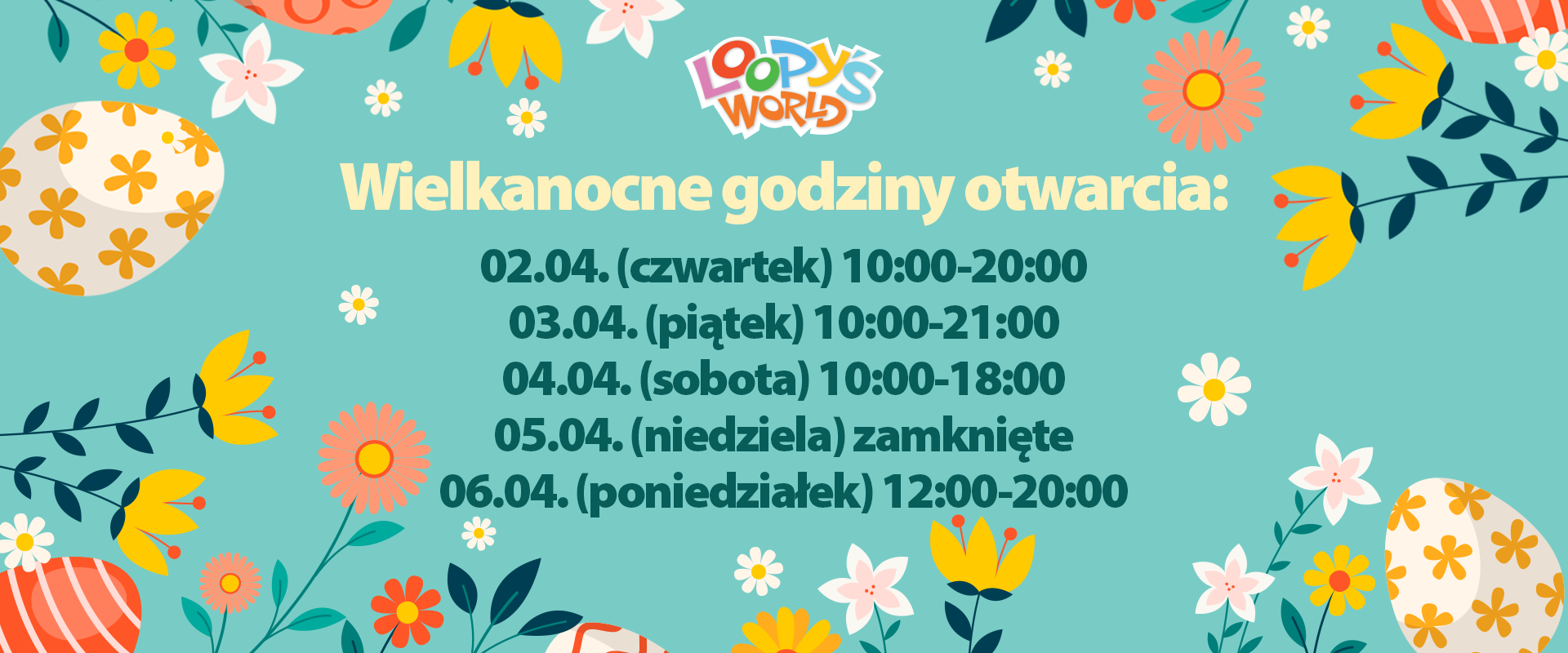 🌸🐣 Wielkanoc tuż tuż! 🐰🌷 Sprawdź nasze świąteczne godziny otwarcia i zaplanuj wizytę w Loopy’s World Gdańsk 💛 🎉 02.04 (czwartek) – 10:00–20:00