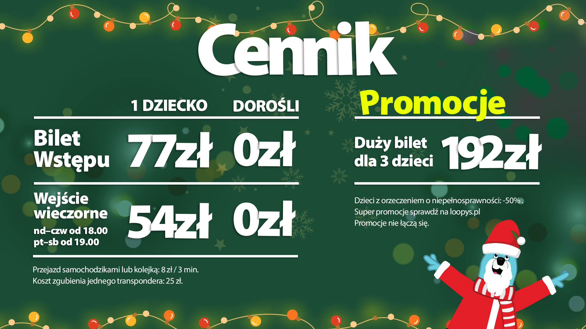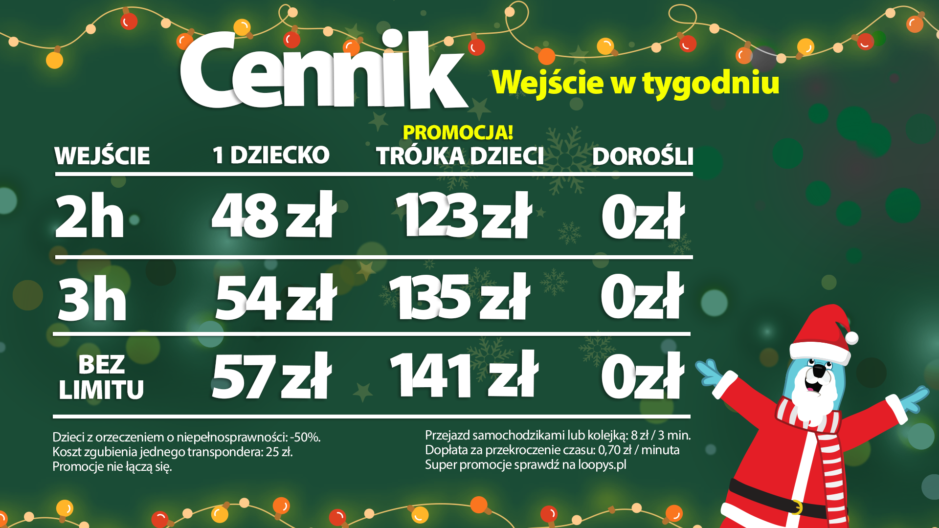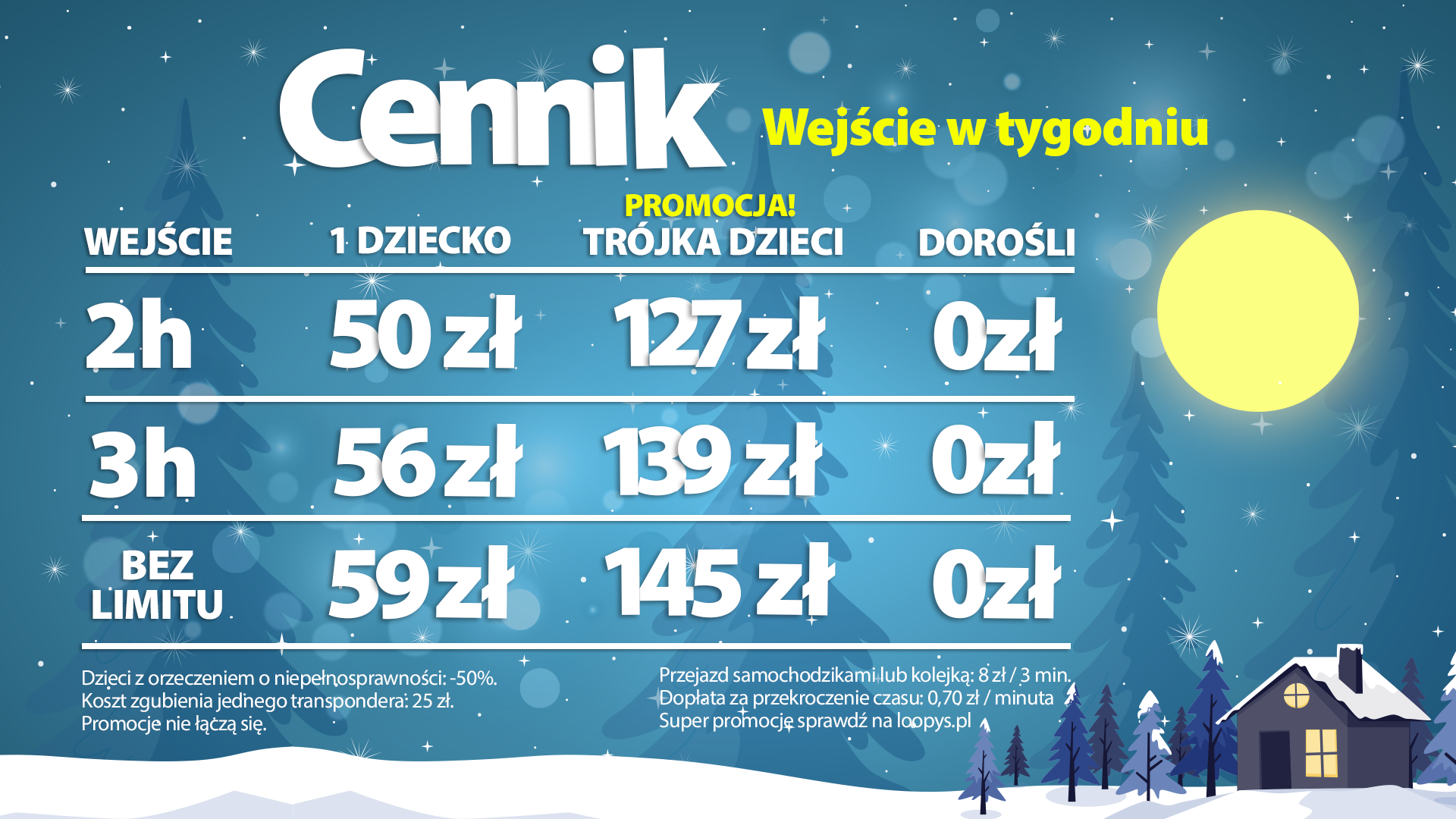 Dzieci poniżej roku oraz powyżej 14 lat bawią się gratis (jeśli wchodzą wraz z dzieckiem w wieku 1-14 lat oraz opiekunem). W przypadku dzieci powyżej 14 lat należy okazać legitymację szkolną.